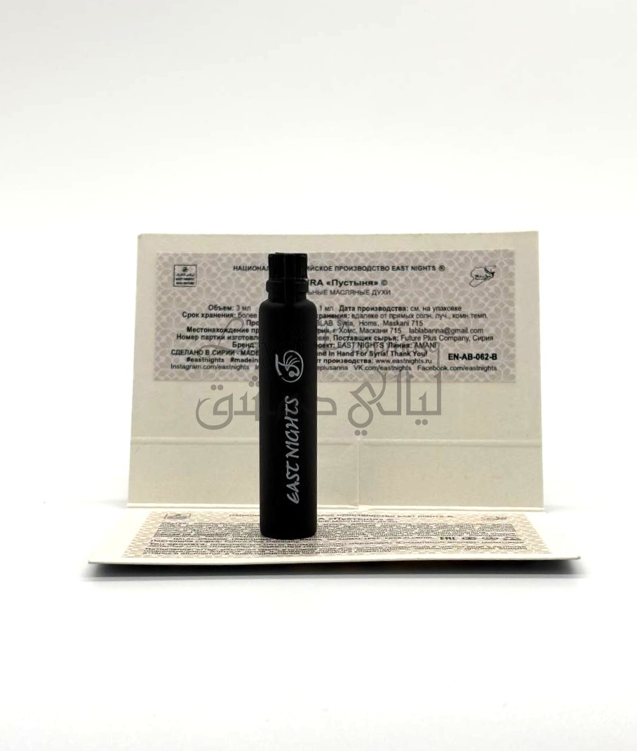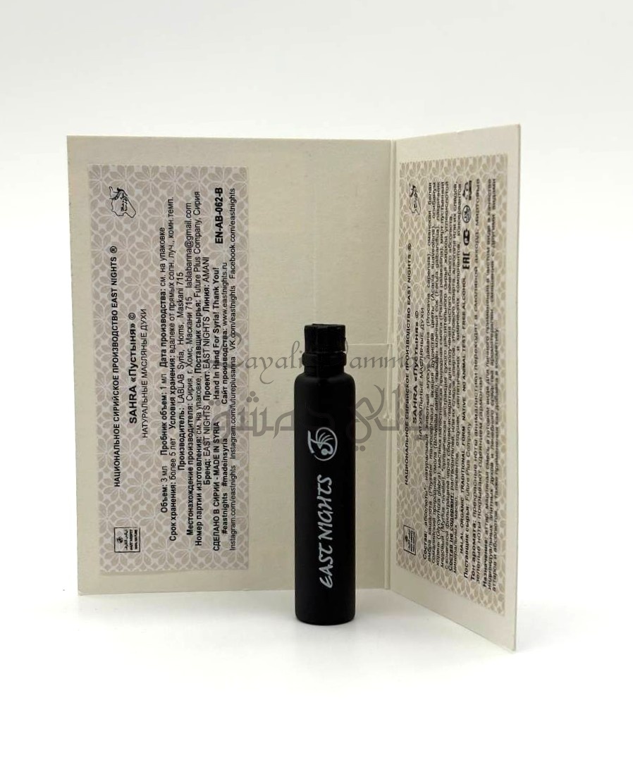 Состав: абсолюты: натуральный животный мускус дамана, оманская белая амбра кашалота, акация душистая цветы, олибанум сомалийский природная смола, гальман млечный сок, лакричник корень, мастика палестинская природная смола, мирт пустынный медовый.